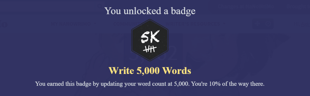 Today, I’m excited to share a significant milestone in my NaNoWriMo journey—I reached 5,000 words and earned the coveted badge! This puts me at 10% of the way to my goal, and it’s a reminder that dedication and persistence pay off. Every word written is another step forward, and this achievement fills me with motivation to keep going. 🖋️