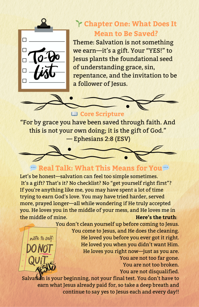 This chapter focuses on what salvation truly is—not a reward for good behavior, but a gift of grace. I dug into Scriptures like Ephesians 2:8–9, Titus 3:5, Romans 3:23, and John 3:16, and I laid a foundation of what it means to receive, not earn, the love of Jesus.