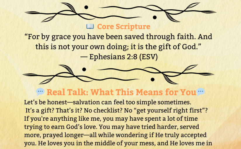 This chapter focuses on what salvation truly is—not a reward for good behavior, but a gift of grace. I dug into Scriptures like Ephesians 2:8–9, Titus 3:5, Romans 3:23, and John 3:16, and I laid a foundation of what it means to receive, not earn, the love of Jesus.