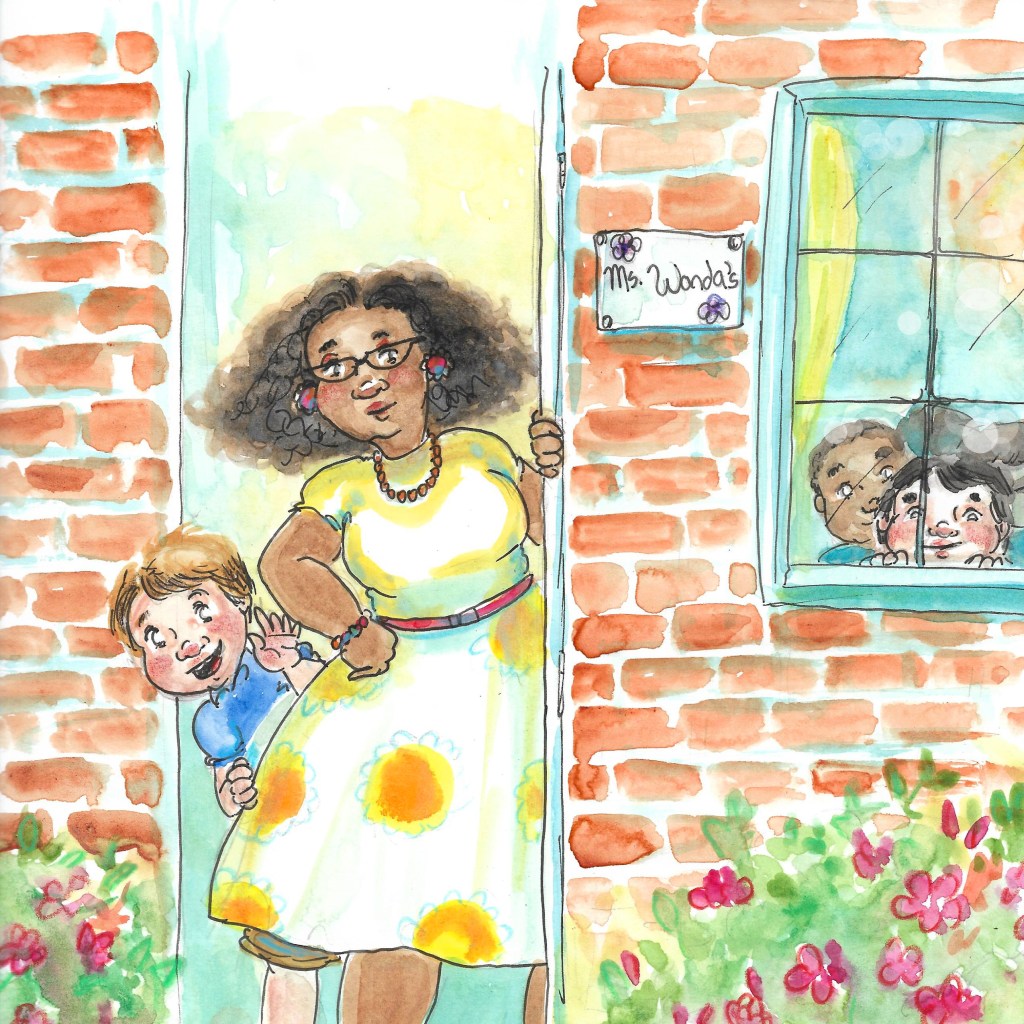 I began the tearfest with noticing her hands in illustrated form, but I really lost control when I saw her house. The fourteenth illustration was Joshua’s rendition of Ms. Wanda, the sitter’s daycare.