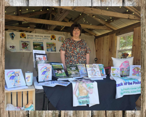 Today, I had a wonderful day at Greene Acres Farm’s Home School Day, where I set up with all my books from Jubilee Junction. Jessica and Leigh Ann were so sweet and even took pictures of me before all the families came through.